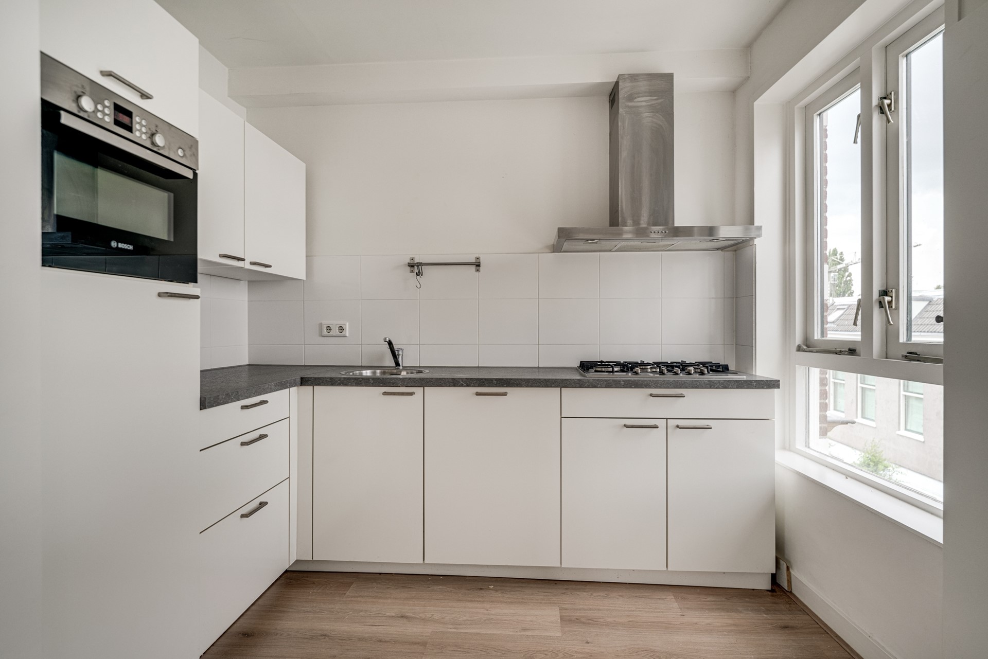 Via de entree op de tweede verdieping komt u in de hal van het appartement. Vanuit hier zijn de verschillende vertrekken bereikbaar. De woonkamer vormt samen met de open keuken een ruime en lichte leefruimte. De keukenopstelling dateert uit circa 2015 en is voorzien van diverse inbouwapparatuur, waaronder een kookplaat, oven, afzuigkap, koelkast en vaatwasser.