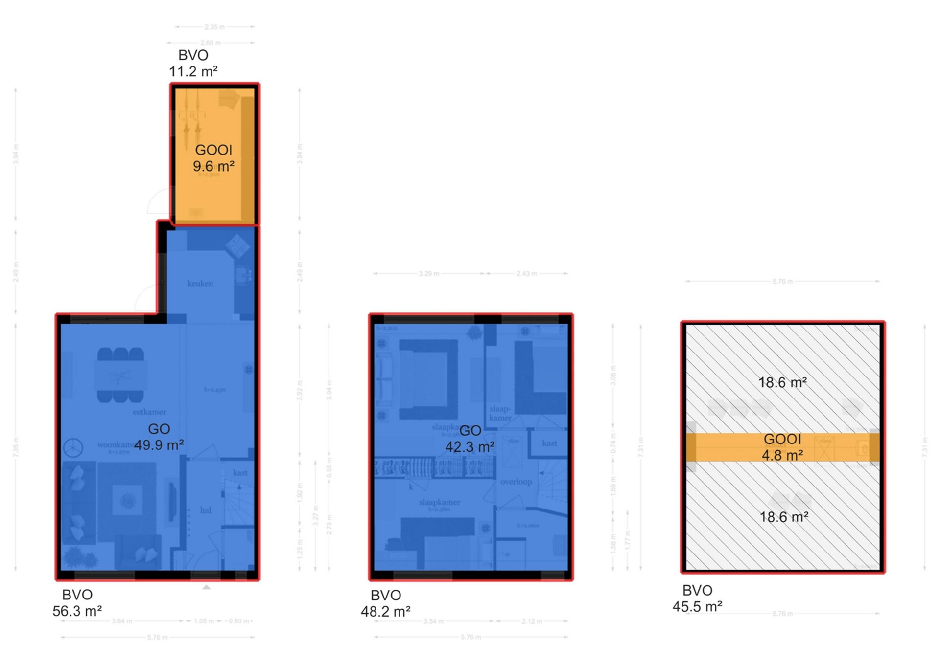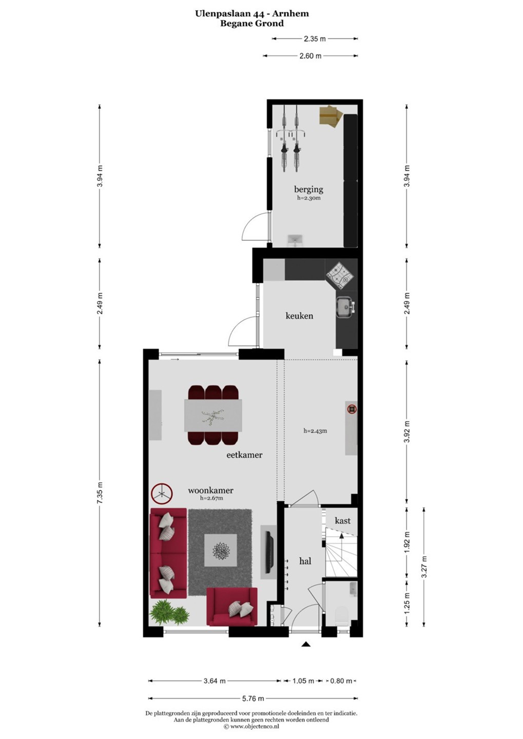 Begane grond: Hal/entree, toilet, opbergkast, woonkamer, eetkamer, keuken, berging.