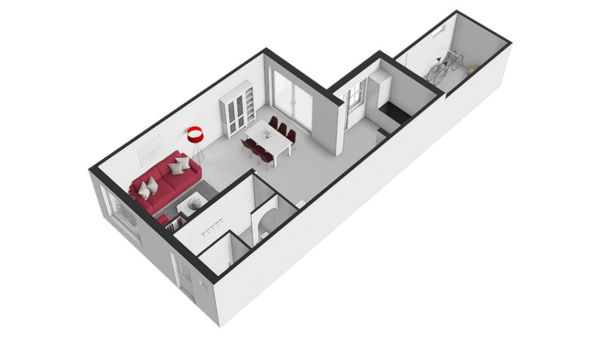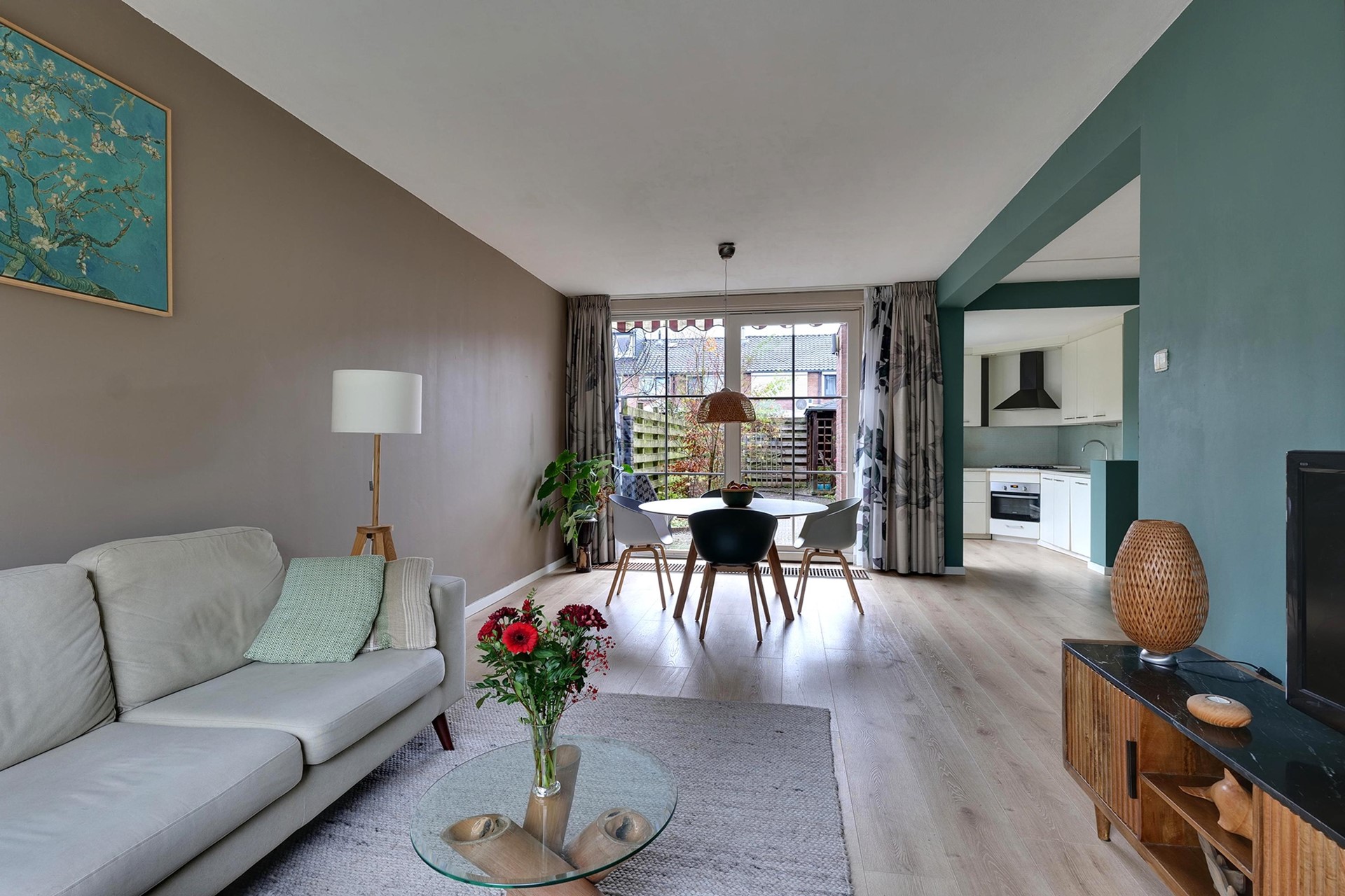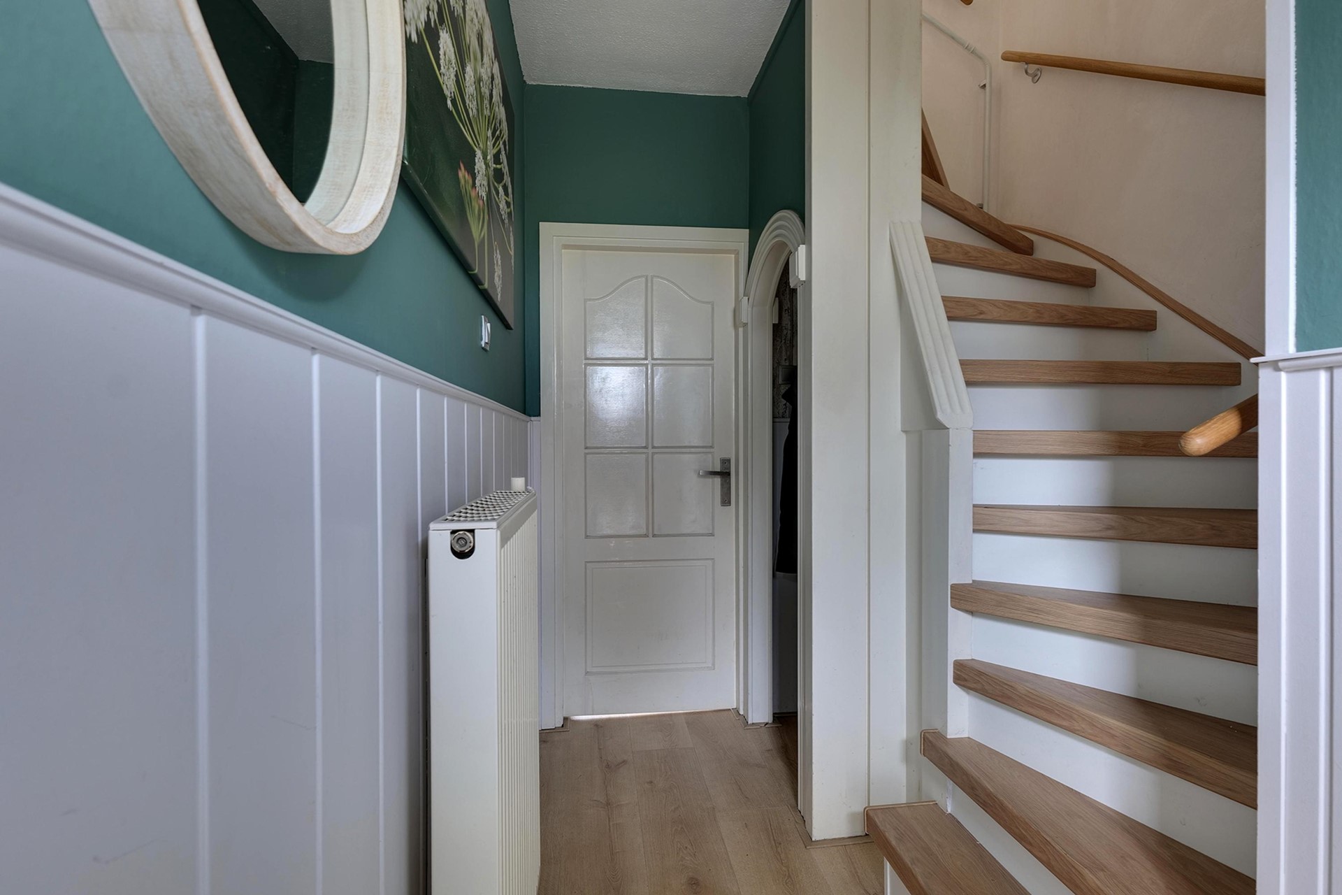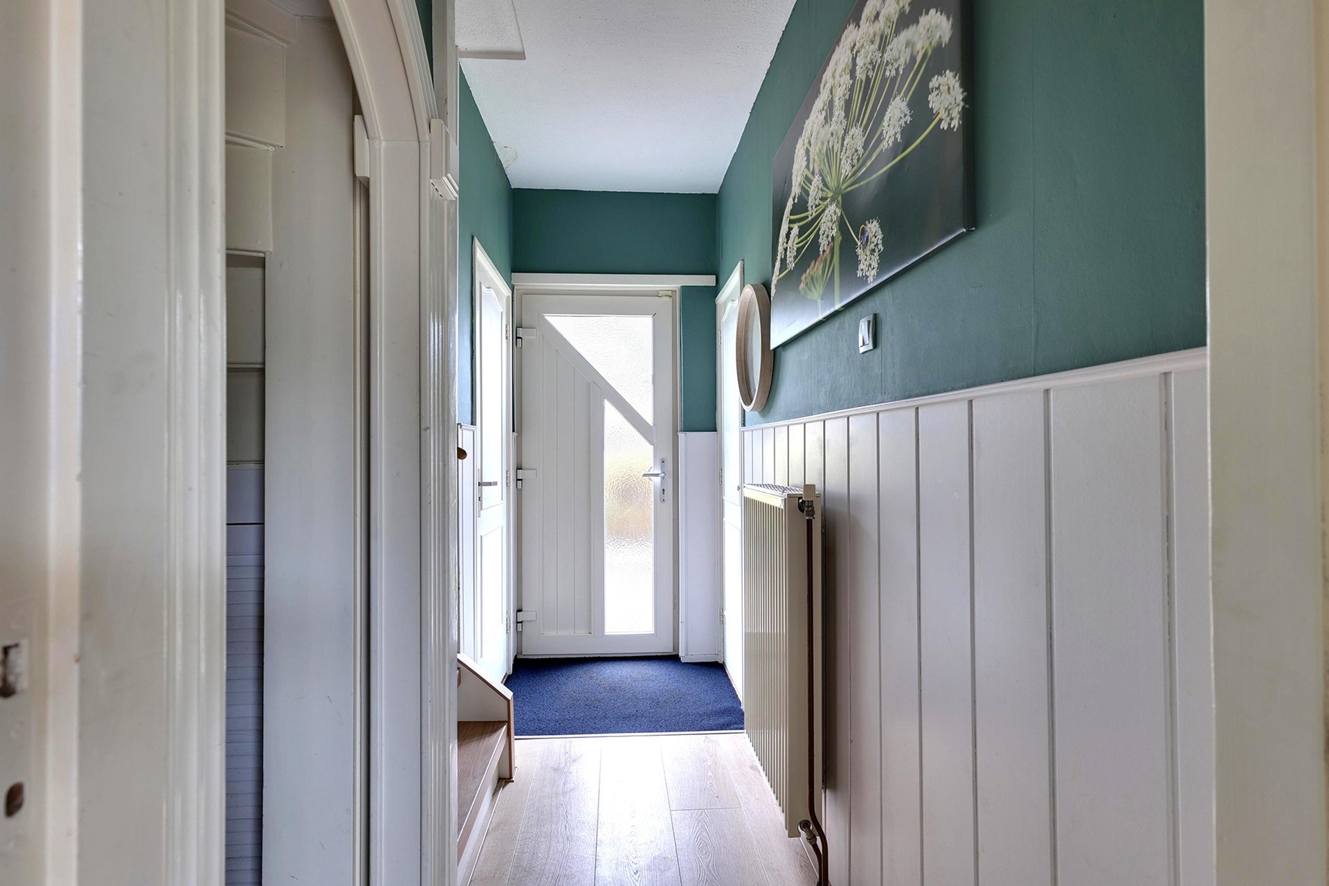 Bij binnenkomst valt direct de ruime woonkamer op, die samen met de eethoek een sfeervolle leefruimte vormt. De grote ramen zorgen voor veel licht en een uitnodigende uitstraling. Aan de achterzijde sluit de woonkamer aan op de halfopen keuken, waar voldoende werkruimte zorgt voor een praktische indeling. Direct achter de keuken ligt een royale berging, ideaal voor extra opslag, fietsen of hobby’s. In de hal bevinden zich verder het toilet en de trapopgang.